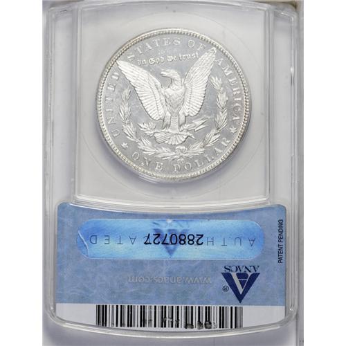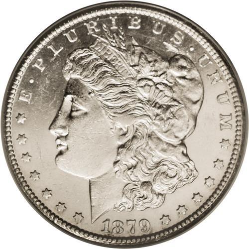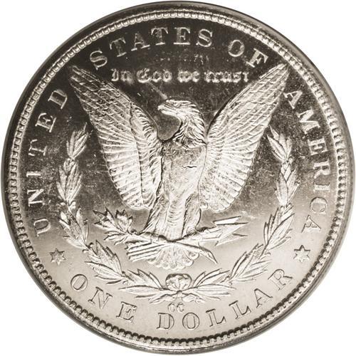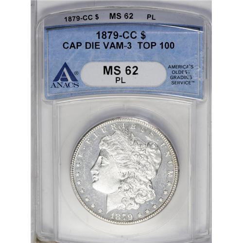 <B>1879-CC<img border='0' src='http://www.heritagecoins.com/images/star.gif' width=10 height=10>$1> Capped Die MS62 Prooflike ANACS.</B></I> VAM-3. A Top 100 Variety. This well mirrored example offers moderate mint frost over the devices. The surfaces are untoned, save for a thin ring of gold around the rims on each side. Numerous light to moderate abrasions, more so on the obverse than reverse, confirm the grade. As both a <Guide Book< and a Fey-Oxman <Top 100 Morgan Dollar Varieties< coin, the Capped Die issue in high grades appears well poised for future appreciation and enthusiasm on the part of the countless numbers of Morgan dollar collectors. Although it is less popular than the Perfect Mintmark variant, is it scarcer in high grades.