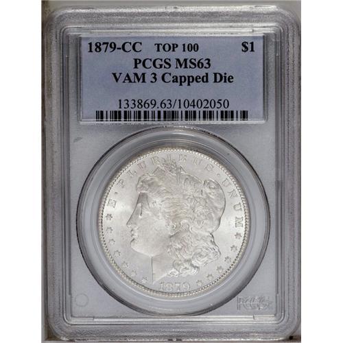 <B>1879-CC<img border='0' src='http://www.heritagecoins.com/images/star.gif' width=10 height=10>$1> Capped Die MS63 PCGS.</B></I> VAM-3. A Top 100 Variety. Mostly brilliant with relatively unmarked, satiny fields and above-average sharpness for this interesting variety. <BR><BR><B>Important notice:</B> Heritage usually auctions material at the rate of 200-250 lots per hour. On some occasions eBay Live bid software or the Internet may not be able to keep up with the pace of the auction. We recommend placing a realistic absentee bid now as insurance to avoid disappointment. Occasionally the auctioneer may eliminate or reject an eBay Live bid, and the auctioneer may also reopen a lot after the close of the eBay live bidding (usually because we missed an audience bid), and may reject your bid even if it shows you as the winning bidder. By bidding via eBay Live, you agree that Heritage may award the lot to another bidder at its sole discretion under the circumstances described above or any other reasonable circumstances. Since eBay bids are not shown to us until we open the lot on the floor, we treat those bids just like floor bids. In most cases the floor responds before the eBay bid is presented to us, due to Internet lag time, so for consistency we have made it a policy that floor bids are always considered first over tie eBay live bids. Also please note that all Heritage lots purchased through eBay Live carry a 20% Buyer's Premium. Please make sure you read the Terms and Conditions before you bid. This lot is being auctioned in conjunction with a live floor auction by Heritage Galleries & Auctioneers. All final auction and invoice information will be supplied by Heritage Galleries & Auctioneers, and all other information should be considered preliminary. Lot:3238 <BR><BR><B>Winning Notification and Billing:</B> After the FINAL session in this auction is complete, Heritage will send e-mail and snail mail invoices. This process normally takes several days. All final auction and invoice information will be supplied by Heritage Galleries & Auctioneers, and all other information should be considered preliminary. <BR><BR>This auction will be conducted on a live auction floor and over the Internet through eBay Live. If you choose to place an absentee bid, please take a moment to <font color='#0000ff'><u><a href='http://pages.ebay.com/liveauctions/help/before/laabsentee.html'>learn how eBay Live absentee bidding works</a></u></font><font color='#000000'>