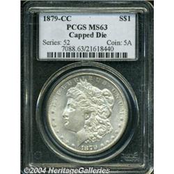 <B>1879-CC<S$1> Capped Die MS63 PCGS.</B></I> At first glance, this lovely dollar has the appearance of Gem quality, yet is limited in grade strictly because of a few very faint lines on Liberty's cheek. This is very good news for the collector who wants an aesthetically pleasing example of this variety at a considerably lower price than Gem examples realize. Lustrous with satiny surfaces and very light rose toning. <BR><BR><B>Important notice:</B> Heritage usually auctions material at the rate of 200-250 lots per hour. On some occasions eBay Live bid software or the Internet may not be able to keep up with the pace of the auction. We recommend placing a realistic absentee bid now as insurance to avoid disappointment. Occasionally the auctioneer may eliminate or reject an eBay Live bid, and the auctioneer may also reopen a lot after the close of the eBay live bidding (usually because we missed an audience bid), and may reject your bid even if it shows you as the winning bidder. By bidding via eBay Live, you agree that Heritage may award the lot to another bidder at its sole discretion under the circumstances described above or any other reasonable circumstances. Since eBay bids are not shown to us until we open the lot on the floor, we treat those bids just like floor bids. In most cases the floor responds before the eBay bid is presented to us, due to Internet lag time, so for consistency we have made it a policy that floor bids are always considered first over tie eBay live bids. Also please note that all Heritage lots purchased through eBay Live carry a 20% Buyer's Premium. Please make sure you read the Terms and Conditions before you bid. </span></font></tr></table></td></tr></table>