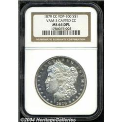 <B>1879-CC<S$1> Capped Die MS64 Deep Mirror Prooflike NGC.</B></I> VAM-3. Top 100 Variety. A scarce and underappreciated variety that is now believed to be a repunched medium over small mintmark. Frosty and bold with splendid contrast and reflectivity. The reverse is pleasing, while the obverse shows a few small, scattered contact marks that are typical for the assigned grade. <BR><BR><B>Important notice:</B> Heritage usually auctions material at the rate of 200-250 lots per hour. On some occasions eBay Live bid software or the Internet may not be able to keep up with the pace of the auction. We recommend placing a realistic absentee bid now as insurance to avoid disappointment. Occasionally the auctioneer may eliminate or reject an eBay Live bid, and the auctioneer may also reopen a lot after the close of the eBay live bidding (usually because we missed an audience bid), and may reject your bid even if it shows you as the winning bidder. By bidding via eBay Live, you agree that Heritage may award the lot to another bidder at its sole discretion under the circumstances described above or any other reasonable circumstances. Since eBay bids are not shown to us until we open the lot on the floor, we treat those bids just like floor bids. In most cases the floor responds before the eBay bid is presented to us, due to Internet lag time, so for consistency we have made it a policy that floor bids are always considered first over tie eBay live bids. Also please note that all Heritage lots purchased through eBay Live carry a 20% Buyer's Premium. Please make sure you read the Terms and Conditions before you bid. </span></font></tr></table></td></tr></table>