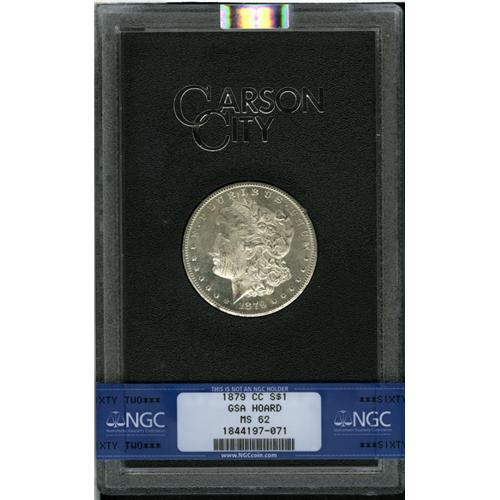 <B>1879-CC<img border='0' src='http://www.heritagecoins.com/images/star.gif' width=10 height=10>$1> MS62 NGC.</B></I> Normal mintmark. Encased in the black plastic holder as released by the GSA in the 1970s, and now certified by NGC with their seal and band. A splendid and desirable example with dusky brown toning on the obverse. The surfaces on both sides are fully lustrous with reflective fields. Few examples of this date were available to collectors from the Treasury holdings sold by the General Services Administration. <BR><BR><B>Important notice:</B> Heritage usually auctions material at the rate of 200-250 lots per hour. On some occasions eBay Live bid software or the Internet may not be able to keep up with the pace of the auction. We recommend placing a realistic absentee bid now as insurance to avoid disappointment. Occasionally the auctioneer may eliminate or reject an eBay Live bid, and the auctioneer may also reopen a lot after the close of the eBay live bidding (usually because we missed an audience bid), and may reject your bid even if it shows you as the winning bidder. By bidding via eBay Live, you agree that Heritage may award the lot to another bidder at its sole discretion under the circumstances described above or any other reasonable circumstances. Since eBay bids are not shown to us until we open the lot on the floor, we treat those bids just like floor bids. In most cases the floor responds before the eBay bid is presented to us, due to Internet lag time, so for consistency we have made it a policy that floor bids are always considered first over tie eBay live bids. Also please note that all Heritage lots purchased through eBay Live carry a 20% Buyer's Premium. Please make sure you read the Terms and Conditions before you bid. This lot is being auctioned in conjunction with a live floor auction by Heritage Galleries & Auctioneers. All final auction and invoice information will be supplied by Heritage Galleries & Auctioneers, and all other information should be considered preliminary. Lot:5430 <BR><BR><B>Winning Notification and Billing:</B> After the FINAL session in this auction is complete, Heritage will send e-mail and snail mail invoices. This process normally takes several days. All final auction and invoice information will be supplied by Heritage Galleries & Auctioneers, and all other information should be considered preliminary. <BR><BR>This auction will be conducted on a live auction floor and over the Internet through eBay Live. If you choose to place an absentee bid, please take a moment to <font color='#0000ff'><u><a href='http://pages.ebay.com/liveauctions/help/before/laabsentee.html'>learn how eBay Live absentee bidding works</a></u></font><font color='#000000'>