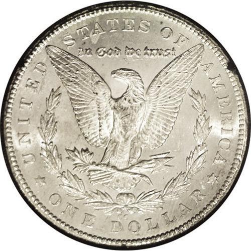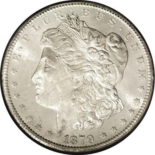 <B>1879-CC<img border='0' src='http://www.heritagecoins.com/images/star.gif' width=10 height=10>$1> MS64 NGC.</B></I> A fully lustrous near-Gem example of the regular or perfect mintmark variety. Both sides exhibit faint champagne iridescence and the fields are slightly prooflike as often seen. Some bagmarks and other minor abrasions are evident, mostly on the obverse. A lightly marked obverse with a cleaner reverse is typical for these large cartwheels.