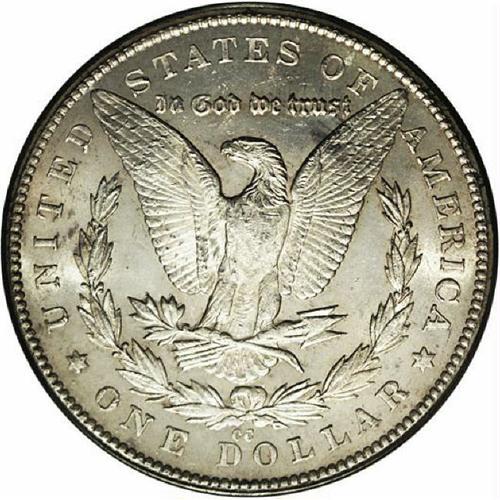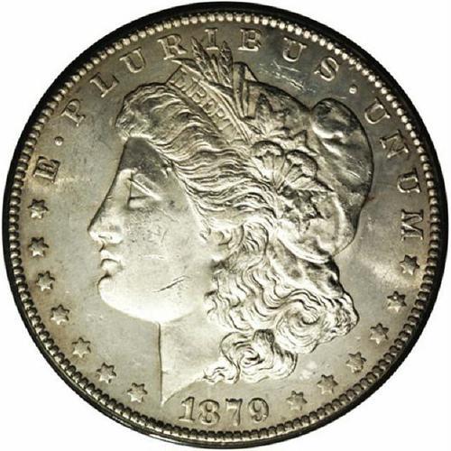 <B>1879-CC<img border='0' src='http://www.heritagecoins.com/images/star.gif' width=10 height=10>$1> MS61 PCGS.</B></I> A creamy specimen with a blush of golden color across each side. The design features are boldly struck, even in the telltale areas, and are mildly abraded on the central devices, limiting the grade of the piece. A satiny and attractive example of this scarce, low mintage Carson City dollar.