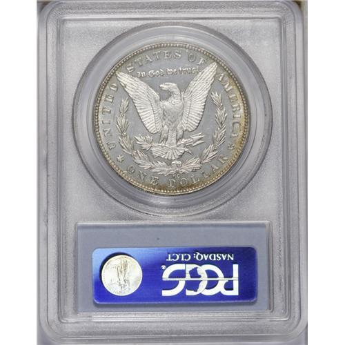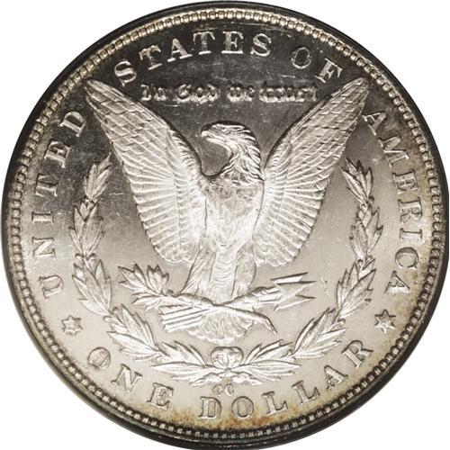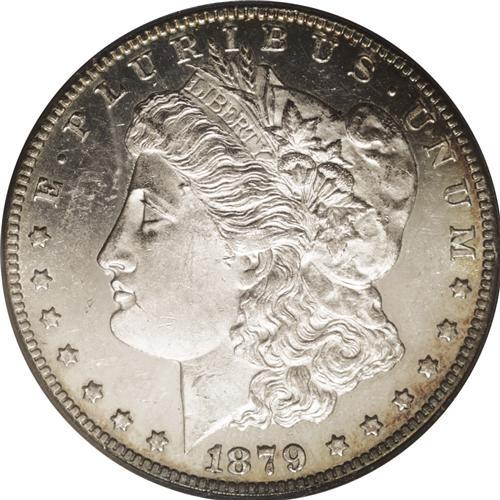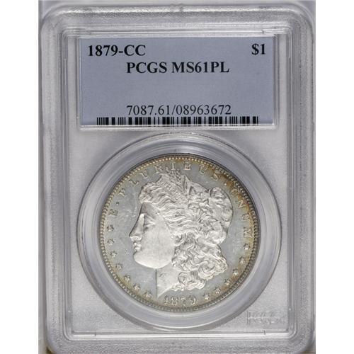 <B>1879-CC<img border='0' src='http://www.heritagecoins.com/images/star.gif' width=10 height=10>$1> MS61 Prooflike PCGS.</B></I> Well struck with flashy, prooflike fields and lovely frosted devices. The obverse has numerous bagmarks and a scuffy appearance, limiting the grade. Soft antique-golden patina circles the borders on each side.
