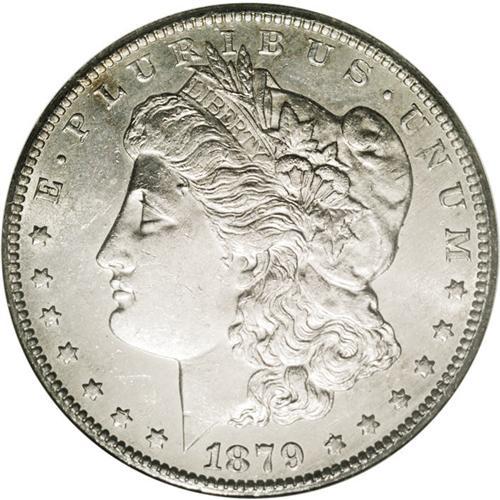 <B>1879-CC<img border='0' src='http://www.heritagecoins.com/images/star.gif' width=10 height=10>$1 MS62 ANACS.</B></I> An immensely popular Morgan dollar from the Carson City Mint, the 1879-CC boasts a limited original mintage of 756,000 pieces. What's more, fewer examples appear to have been preserved than those of such other early CC-mint deliveries as the 1881-CC and 1885-CC. The otherwise richly frosted sheen of the present example thins to modest brightness in the fields. The strike is bold, if not sharp in all areas, and there are only superficial bagmarks on the obverse that limit the grade (the reverse is nearly pristine). Evenly patinated in charcoal-gray hues on the obverse and light-gray color on the reverse.