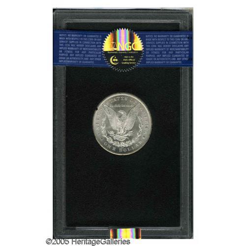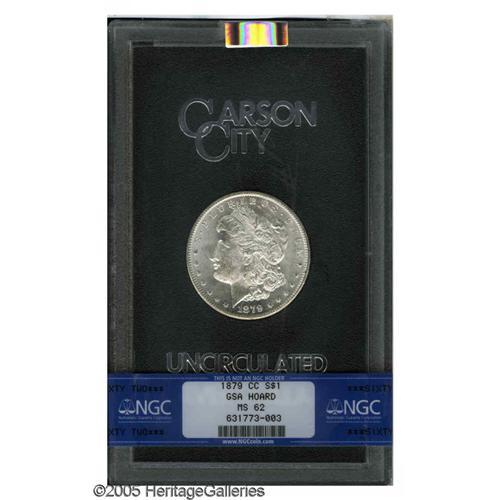 <B>1879-CC<S$1> MS62 NGC.</B></I> A brilliant and well struck rare date Carson City Dollar. The cheek is moderately marked, while the reverse is splendidly preserved save for a faint fingerprint on the upper field. The box and certificate of GSA issue accompany. Many GSA-issued 1879-CC Dollars were presumably broken out of their GSA holders over the past 25 years, the present piece is an exception.