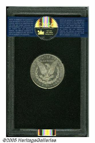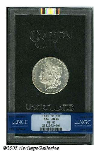 <B>1879-CC<S$1> MS62 NGC.</B></I> A nicely struck, nearly brilliant, and typically abraded example. The fields are rather prooflike, although not certified as such by NGC. The 1879-CC is much tougher to locate in a GSA holder than any other pre-1889 Carson City date.
