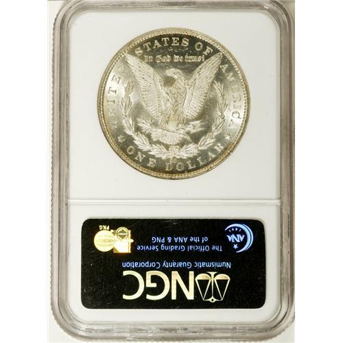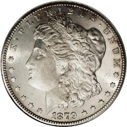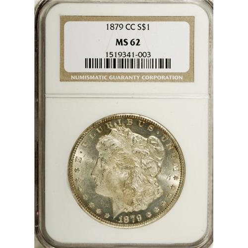 <B>1879-CC S$1 MS62 NGC.</B></I> Partially prooflike fields on this Carson City issue establish good contrast with lightly frosted motifs, irrespective of the angle from which the piece is viewed. Hints of gold-tan color appear around the peripheries and on portions of the central devices. The design elements are well brought up, with at least partial definition in the hair over Liberty's ear and on the eagle's breast. Some light marks on Liberty's cheek and on the eagle preclude a higher grade.<BR><BR><b>Shipping:</b> Coins & Currency (<a target="_blank" href="http://www.heritageauctions.com/common/shipping.php">view shipping information</a>)