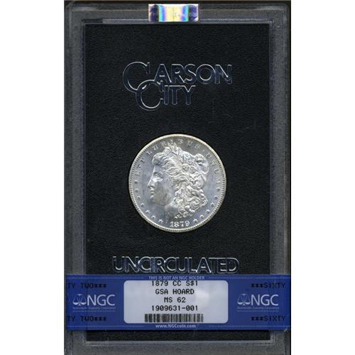 <B>1879-CC S$1 MS62 NGC.</B></I> The Clear CC variety. This gently toned example has a well preserved reverse, and the obverse has no singularly mentionable marks. The 1879-CC is rare within a GSA holder, since most examples have been broken out and submitted to grading services over the past 20 years.<BR><BR><b>Shipping:</b> Coins & Currency (<a target="_blank" href="http://www.heritageauctions.com/common/shipping.php">view shipping information</a>)