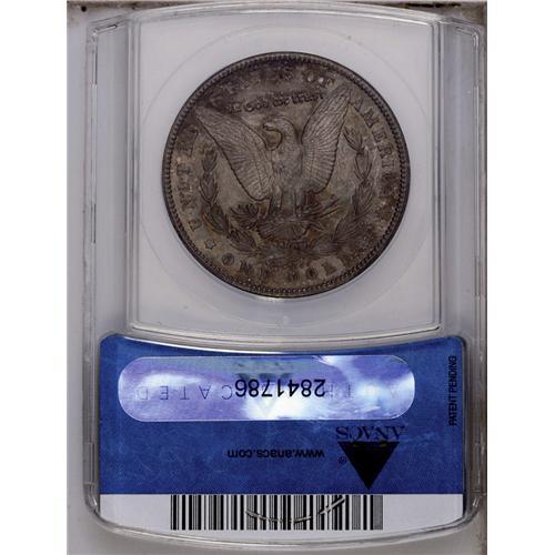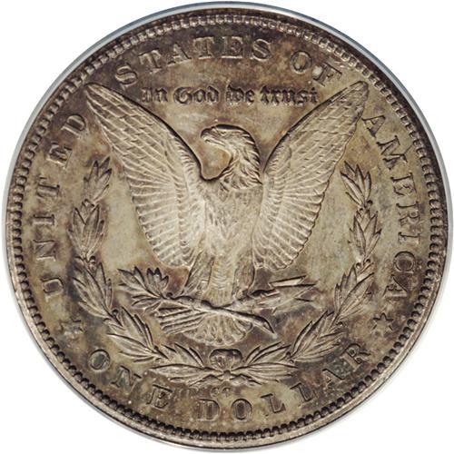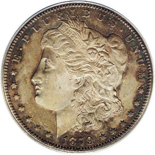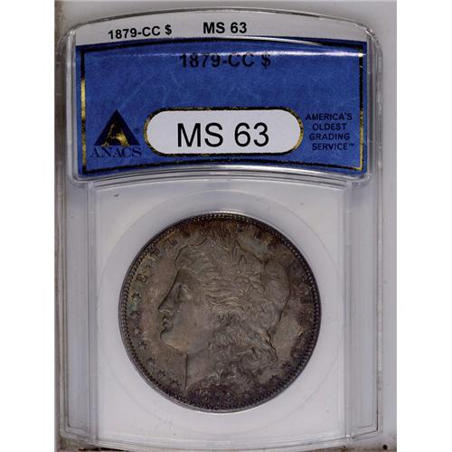 <B>1879-CC<img border='0' src='http://www.heritagecoins.com/images/star.gif' width=10 height=10>$1> MS63 ANACS.</B></I> An immensely popular Morgan dollar from the Carson City Mint, the 1879-CC boasts a limited original mintage of 756,000 pieces. What's more, fewer examples appear to have been preserved than those of such other early CC-mint deliveries as the 1881-CC and 1885-CC. The present example offers a prooflike sheen in the fields under a thick coating of mottled gray-green and reddish-gold toning over each side. The strike is bold, if not sharp in all areas, and there are only a few scattered bagmarks.
