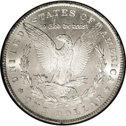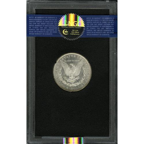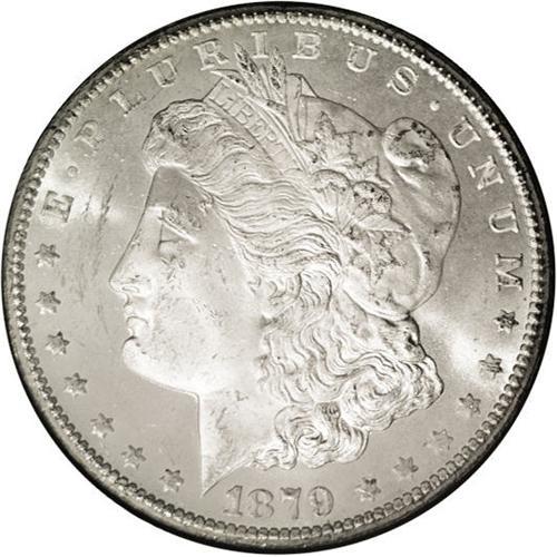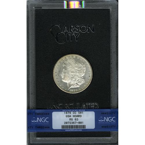 <B>1879-CC<img border='0' src='http://www.heritagecoins.com/images/star.gif' width=10 height=10>$1> MS63 NGC.</B></I> A hint of golden toning endows this crisply struck and mildly prooflike key date Carson City dollar. The reverse is beautifully preserved, and the left obverse is only moderately abraded. Most 1879-CC dollars offered in the 1970s Treasury dispersal were removed from their GSA-issued holders once PCGS and NGC dominated market trading. The present lot is an exception. The black cardboard and felt GSA box accompanies the lot.