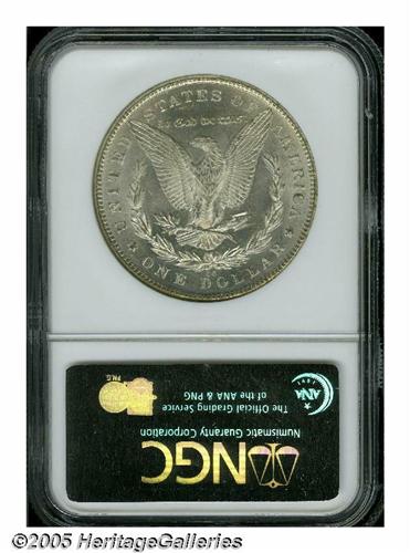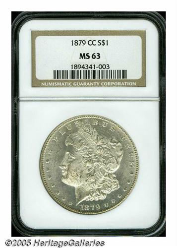 <B>1879-CC<S$1> MS63 NGC.</B></I> A low mintage issue with only 756,000 pieces struck, the 1879-CC has long been one of the most highly sought after Carson City dollars. This coin has strong semi-prooflike mirrors in the fields with a well-balanced appearance from side to side. Sharply struck throughout, there is just the slightest hint of toning over both obverse and reverse. Minimally abraded.