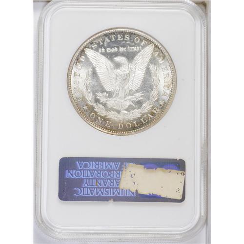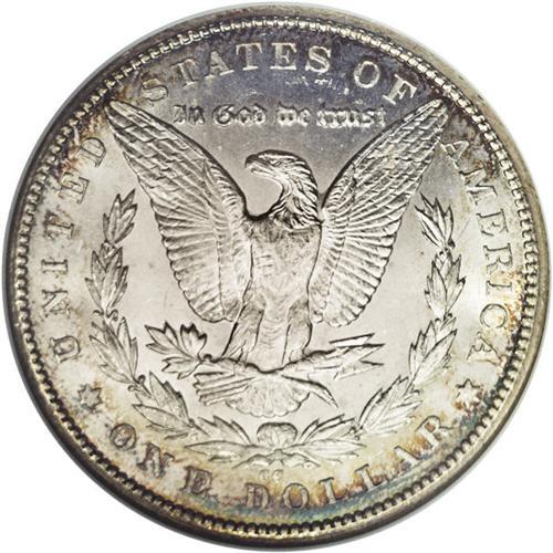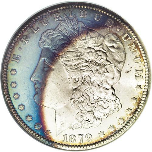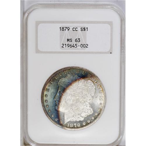 <B>1879-CC<img border='0' src='http://www.heritagecoins.com/images/star.gif' width=10 height=10>$1> MS63 NGC.</B></I> A lustrous and sharply struck piece, moderately mirrored in the brilliant areas of the obverse and mostly brilliant on the reverse. Champagne and pale green toning appears at the reverse periphery, while the obverse has teal over much of the left half of the coin with deep violet at the border.<BR><I>From The Derrick Snider Collection.</B></I>