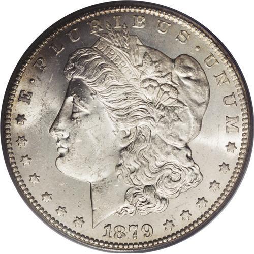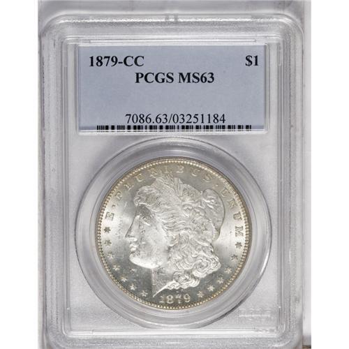 <B>1879-CC S$1 MS63 PCGS.</B></I> Hints of light tan-gold patina visit the peripheries of this radiantly lustrous Morgan. The strike is impressive, with relatively strong definition visible on the design features. A few minute marks scattered about the obverse define the grade. One of 756,000 pieces struck at the Carson city facility.<BR><BR><b>Shipping:</b> Coin/Currency (<a target="_blank" href="http://www.heritageauctions.com/common/shipping.php">view shipping information</a>)