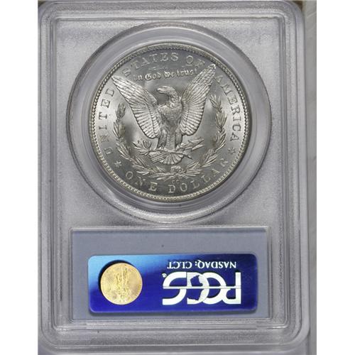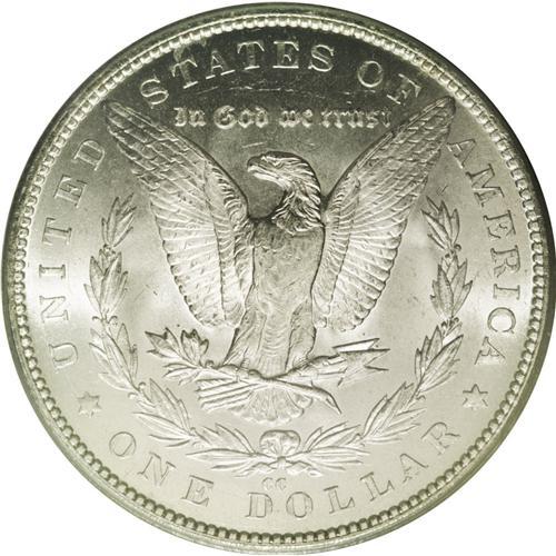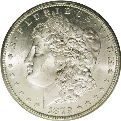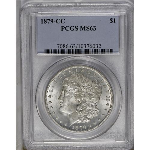<B>1879-CC<img border='0' src='http://www.heritagecoins.com/images/star.gif' width=10 height=10>$1> MS63 PCGS.</B></I> Normal mintmark. Effulgent luster shines from each side of this untoned, chalk-white example. The obverse and reverse surfaces are coated with a fine layer of soft mint frost. The central details are somewhat weak, but the remaining devices are boldly struck. Grade-limiting luster grazes are noted on Liberty's cheek and neck, and in the adjoining field area. A bright and attractive example of this scarce, low-mintage Carson City dollar.