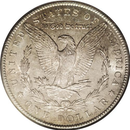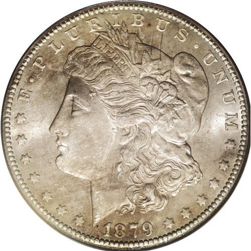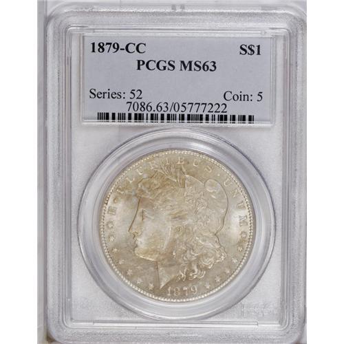 <B>1879-CC<img border='0' src='http://www.heritagecoins.com/images/star.gif' width=10 height=10>$1> MS63 PCGS.</B></I> Perfect Dies. Fully lustrous with typical definition for the assigned grade and hazy gray-tan toning over each side. One of the key Carson City issues and a date that always commands attention in any Mint State condition.