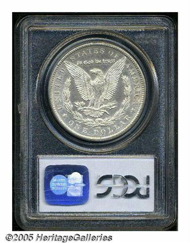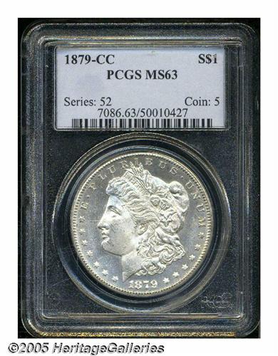<B>1879-CC<S$1> MS63 PCGS.</B></I> This elusive coin is frosty and bright, with ample luster in the fields to please the eye. Close examination will note a few minor reeding marks on Liberty's cheek and nose which will serve to identify this coin. Typically well struck, and a good coin for the collector who wants an attractive Uncirculated coin for their date set. A very difficult decision must be made to figure out what coin can be secured given the realities of budget limitations, and this is one of the more expensive dates to procure.