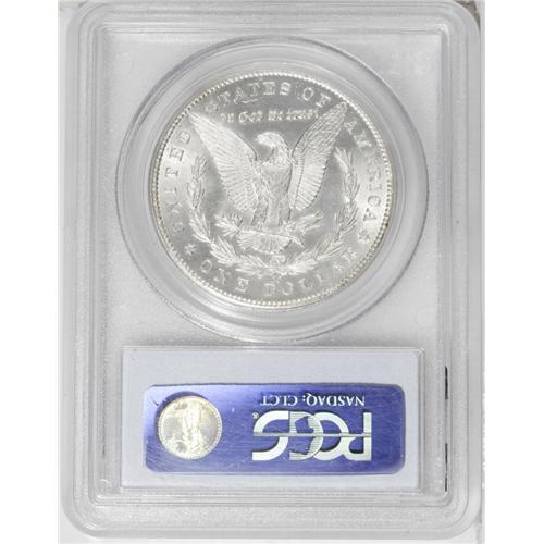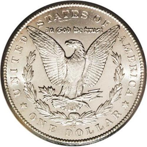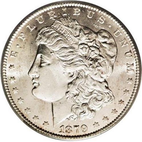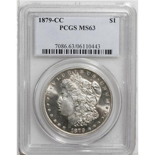 <B>1879-CC<img border='0' src='http://www.heritagecoins.com/images/star.gif' width=10 height=10>$1> MS63 PCGS.</B></I> This is an example of the Normal Mintmark variety, more highly desirable than the so-called Capped Die variety. The surfaces are fully lustrous with frosty devices and satiny fields. Wispy gold toning is faintly visible, mostly on the obverse, but this example will easily qualify as a fully brilliant Morgan dollar.