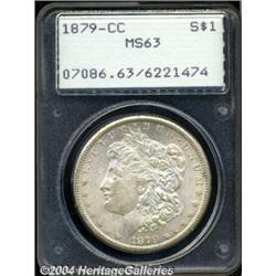 <B>1879-CC<S$1> MS63 PCGS.</B></I> Mostly untoned overall, each side exhibits a well struck appearance with a little milky patina. A few hair strands are missing over Liberty's ear, but the eagle's breast is quite sharp. Only 756,000 pieces were coined and many have been seriously abraded or circulated. This Select specimen shows a small group of luster grazes on Liberty's cheek and neck. Housed in an early PCGS holder. <BR><BR><B>Important notice:</B> Heritage usually auctions material at the rate of 200-250 lots per hour. On some occasions eBay Live bid software or the Internet may not be able to keep up with the pace of the auction. We recommend placing a realistic absentee bid now as insurance to avoid disappointment. Occasionally the auctioneer may eliminate or reject an eBay Live bid, and the auctioneer may also reopen a lot after the close of the eBay live bidding (usually because we missed an audience bid), and may reject your bid even if it shows you as the winning bidder. By bidding via eBay Live, you agree that Heritage may award the lot to another bidder at its sole discretion under the circumstances described above or any other reasonable circumstances. Since eBay bids are not shown to us until we open the lot on the floor, we treat those bids just like floor bids. In most cases the floor responds before the eBay bid is presented to us, due to Internet lag time, so for consistency we have made it a policy that floor bids are always considered first over tie eBay live bids. Also please note that all Heritage lots purchased through eBay Live carry a 20% Buyer's Premium. Please make sure you read the Terms and Conditions before you bid. </span></font></tr></table></td></tr></table>