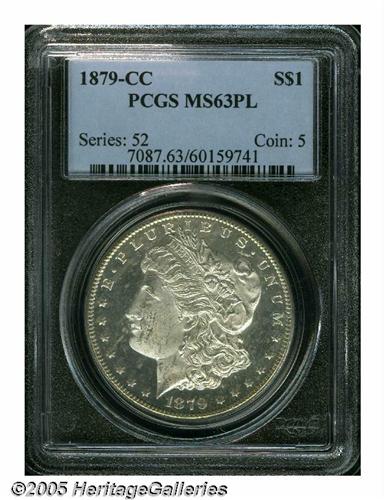 <B>1879-CC<S$1> MS63 Prooflike PCGS.</B></I> The 1879-CC is a scarce issue among Carson City Dollars. Only 756,000 pieces were produced, and a relatively high number of Prooflikes are extant. However, pleasing high grade examples such as this one are very scarce. There is considerable mint frost on the devices, which gives the coin a pronounced two-toned contrast. The well articulated features are crisply defined throughout, and, while scuffiness on the cheek, and in the obverse fields is a grade-limiting factor, the reverse displays Gemlike preservation and a partial layer of milky, pale golden toning.
