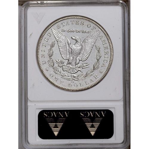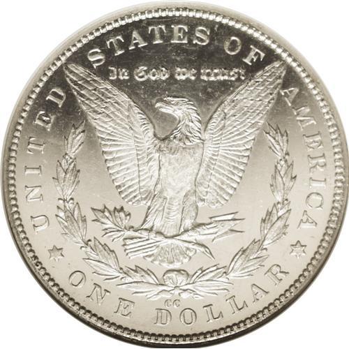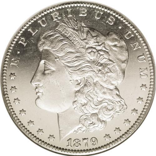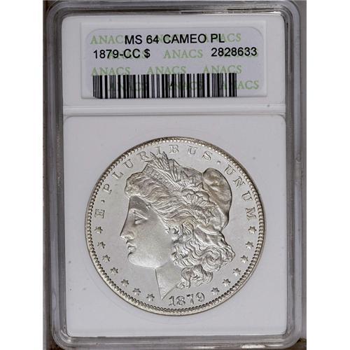 <B>1879-CC<img border='0' src='http://www.heritagecoins.com/images/star.gif' width=10 height=10>$1> MS64 Cameo Prooflike ANACS.</B></I> This brilliant near-Gem features impressive reflectivity, and the frosty devices provide obvious contrast with the surprisingly unabraded mirror fields. The strike is above average, although not quite full on the leaf left of the ribbon bow. Any 1879-CC dollar is under tremendous collector demand, but examples of the present quality are highly desirable.