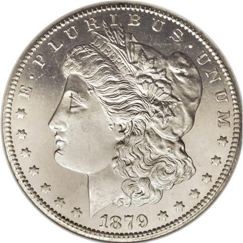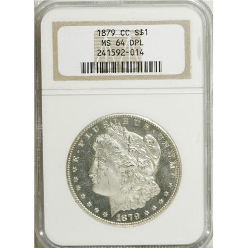<B>1879-CC S$1 MS64 Deep Mirror Prooflike NGC.</B></I> This is the highly desirable Normal Mintmark variety. Both sides are sharply struck with full hair definition over Liberty's ear and sharp breast feathers on the eagle. The surfaces are fully brilliant with no evidence of toning, and exhibit frosty design motifs that are surrounded by deeply mirrored fields. Although a few numerically finer examples of the '79-CC Morgan exist with frosty or satiny surfaces, this date is virtually impossible to locate any finer with deeply prooflike surfaces. Census: 11 in 64, 1 finer (4/07).<BR><BR><b>Shipping:</b> Coins & Currency (<a target="_blank" href="http://www.heritageauctions.com/common/shipping.php">view shipping information</a>)
