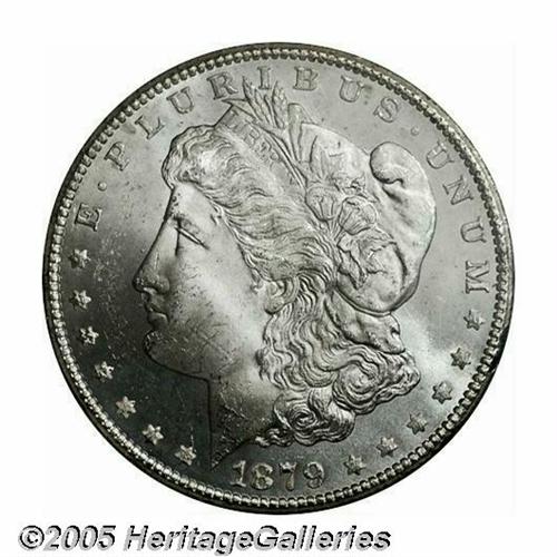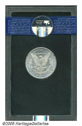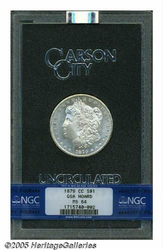 <B>1879-CC<S$1> MS64 NGC In the original GSA holder.</B></I> Clear CC Variety. This is a fully untoned example, that is lightly marked on Liberty's cheek and neck, but not inappropriately so for the grade of MS64. Somewhat soft above Liberty's ear.