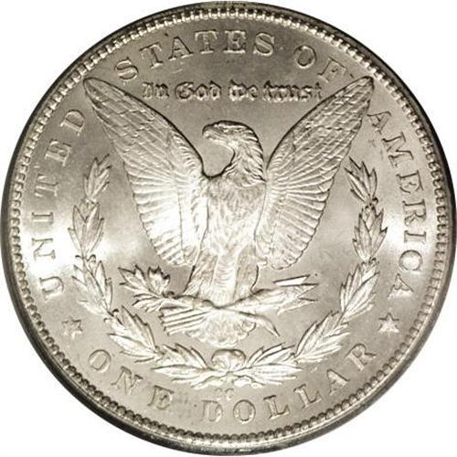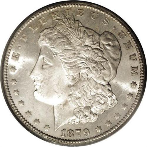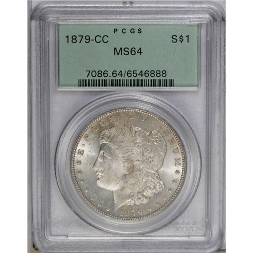 <B>1879-CC<img border='0' src='http://www.heritagecoins.com/images/star.gif' width=10 height=10>$1> MS64 PCGS.</B></I> Clear CC. The devices are fully brilliant, while the fields have just enough soft satin luster to raise speculation that it might not have been long since these dies had made prooflike coins. Predominantly white, with a few spots of tan color mostly on the obverse. An attractive coin, housed in a green label PCGS holder.
