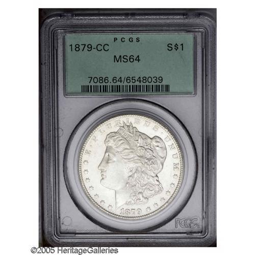 <B>1879-CC<S$1> MS64 PCGS.</B></I> Only 756,000 pieces were produced of the 1879-CC dollar, and apparently very few were dropped into the channels of commerce at that time. George W. Rice said in 1898 that he had never seen one--and he was a dollar specialist. Small quantities were paid out from the 1940s through the 1970s, but this is an issue that has always commanded a significant premium over other Carson City dates. It is also a noteworthy condition rarity in MS64 condition, and worth approximately 50% more than its MS63 counterpart. This piece displays richly textured surfaces that have a pronounced frosted appearance. Well, but not fully struck, there are no singularly mentionable abrasions on either side. Both obverse and reverse are brilliant except for a slight accent of color around the reverse periphery. An outstanding, high-end MS64 example of this scarce, semi-key Carson City issue.