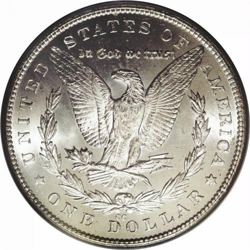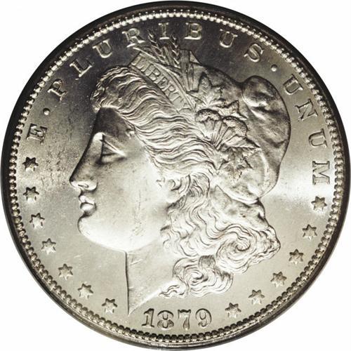 <B>1879-CC<img border='0' src='http://www.heritagecoins.com/images/star.gif' width=10 height=10>$1> MS64 PCGS.</B></I> Seldom does an example of this scarce date appear in the market place with such a high degree of eye appeal. This specimen has fully brilliant silver surfaces with satiny luster. Both sides have clean fields with only the slightest grade-consistent abrasions or blemishes. All of the design elements are boldly rendered. The obverse has a light cameo appearance with reflective fields around frosty devices.