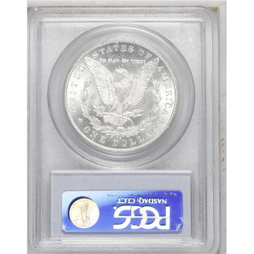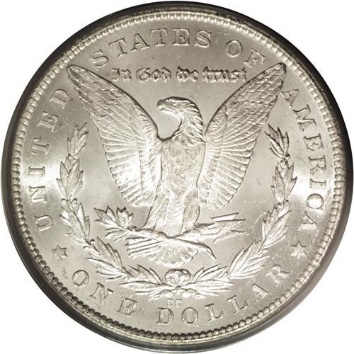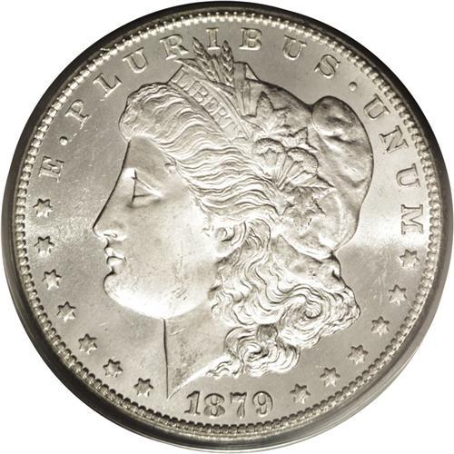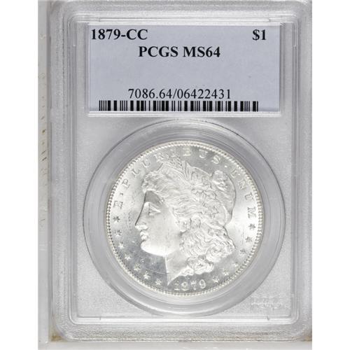 <B>1879-CC<img border='0' src='http://www.heritagecoins.com/images/star.gif' width=10 height=10>$1> MS64 PCGS.</B></I> Seldom does an example of this scarce date appear in the marketplace with such a high degree of eye appeal. This specimen has fully brilliant silver surfaces with satiny luster. Both sides have clean fields with only the slightest grade-consistent abrasions or blemishes. All of the design elements are boldly rendered. The obverse has a light cameo appearance with reflective fields around frosty devices.