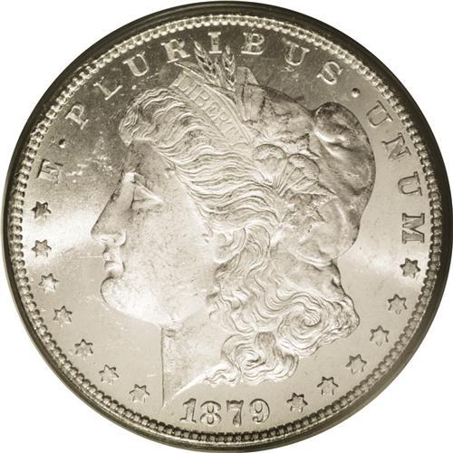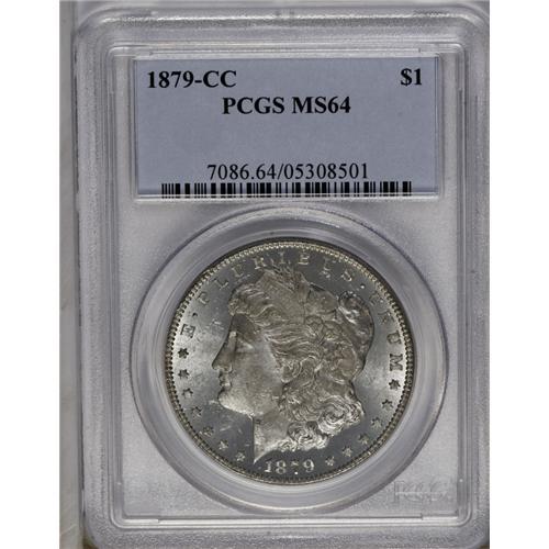 <B>1879-CC<img border='0' src='http://www.heritagecoins.com/images/star.gif' width=10 height=10>$1> MS64 PCGS.</B></I> The fields of this piece display prooflike tendencies, and establish a fairly strong contrast with the frosted, light gray motifs. The design elements are sharply impressed, and include partial definition in the hair over Liberty's ear. A few minor scuffs on the cheek define the grade. A very nice all around coin.