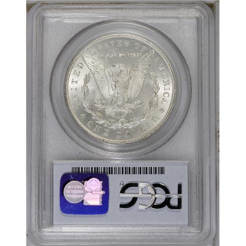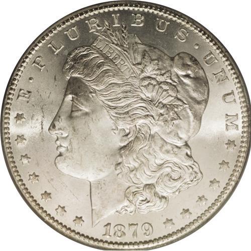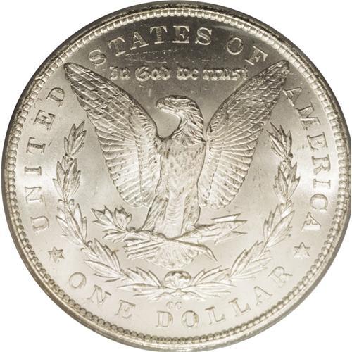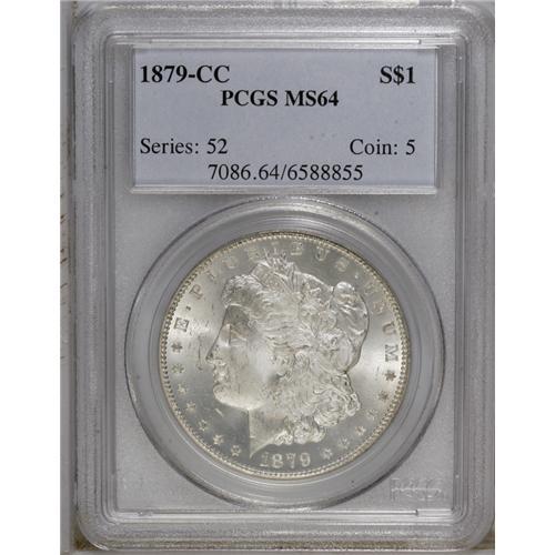 <B>1879-CC<img border='0' src='http://www.heritagecoins.com/images/star.gif' width=10 height=10>$1> MS64 PCGS.</B></I> This Clear CC near-Gem is gently toned in tan and ice-blue tints. Blazing luster illuminates the sharply struck surfaces. The reverse is gorgeously free from contact, as is the right obverse, while the cheek and left obverse field display only light grazes. The 1879-CC is the scarcest Carson City Morgan dollar struck prior to the 1889 re-opening of the Western facility.