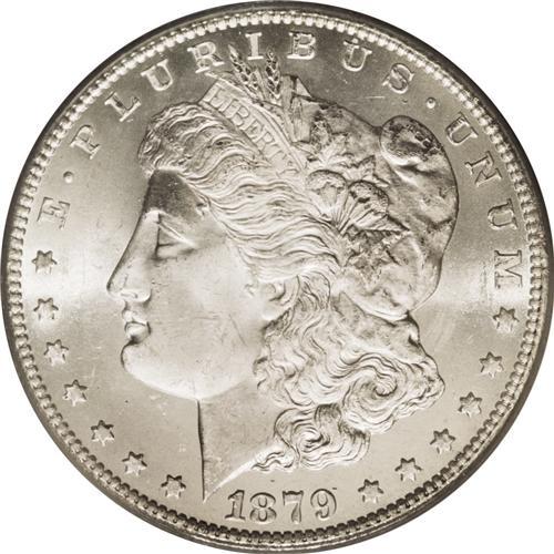 <B>1879-CC<img border='0' src='http://www.heritagecoins.com/images/star.gif' width=10 height=10>$1> MS64 PCGS.</B></I> Typically frosty for the issue, the ice-white surfaces are smooth with few singularly distracting bagmarks. The strike is bold, if not quite full, and the eye appeal benefits even further from a pleasing glow in the fields. A date that is always in demand due to a limited original mintage.
