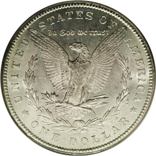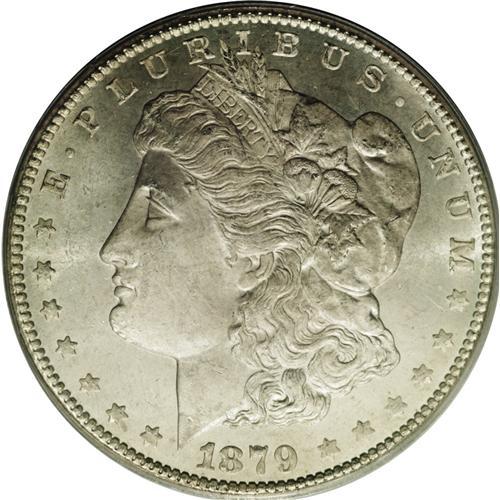 <B>1879-CC<img border='0' src='http://www.heritagecoins.com/images/star.gif' width=10 height=10>$1> MS64 PCGS.</B></I> While lower Mint State 1879-CC coins are quite available, MS64 examples are more elusive, and better-graded specimens are rare. The near-Gem presented in this lot displays a thin veneer of light tan color. The fields are somewhat prooflike, and offer a mild contrast with lightly frosted devices. The design elements are sharply impressed, though the hair over Liberty's ear is a trifle soft. A few minor luster grazes and scuffs on the cheek and neck and in the left (facing) obverse fields define the grade. PCGS has graded 84 coins finer (2/06)