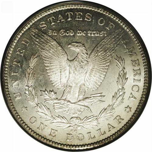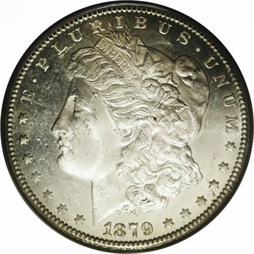 <B>1879-CC<img border='0' src='http://www.heritagecoins.com/images/star.gif' width=10 height=10>$1> MS64 Prooflike ANACS.</B></I> A nicely cameoed example with an overall milky sheen that is more frequently found on reflective 1880-CC Morgans. Luster grazes on the face of Liberty and the eagle's breast are shallow and relatively inoffensive.