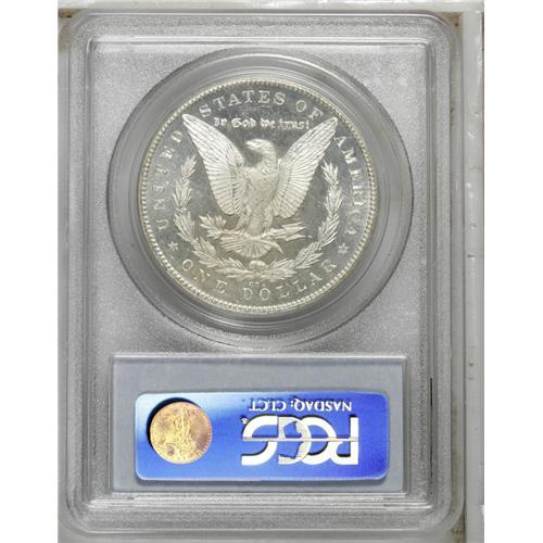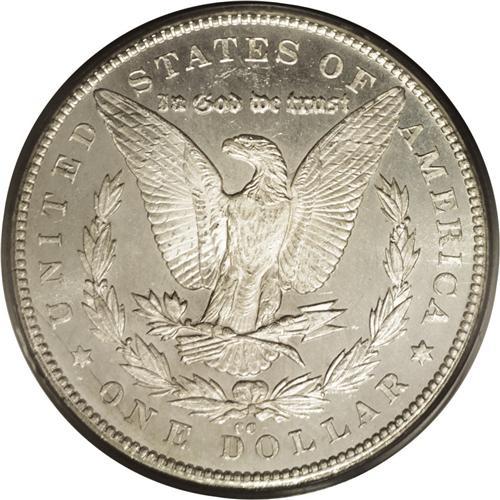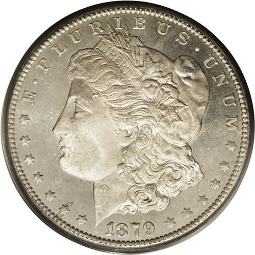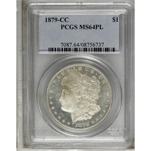 <B>1879-CC<img border='0' src='http://www.heritagecoins.com/images/star.gif' width=10 height=10>$1> MS64 Prooflike PCGS.</B></I> Normal Mintmark. An extremely appealing example of this key-date Morgan dollar, the first of the truly difficult CC-mint issues, along with the 1889 and 1893 emissions. Of course, as a Prooflike coin, this specimen is immeasurably more elusive than a "typical" Mint State 1879-CC. While PCGS has graded a total of 670 pieces in MS64 or higher, it has designated only 58 pieces MS64 Prooflike or finer. The results are similar at NGC: <I>Only about 10% of MS64 and finer examples are certified Prooflike at both services,</B></I> 95 pieces out of 996, to be exact. The current coin offers glacial mint frost over the devices on both sides, with brilliantly mirrored fields that border on a Deep Mirror designation. Although the coin is untoned, there is a slight golden cast, a bit more so on the obverse than on the reverse. There are light abrasions, none of them distracting or deep, on Liberty's cheek that define the grade, but the reverse on its own would perhaps rate a Gem grade, and even the obverse appears high-end. Opportunity knocks.
