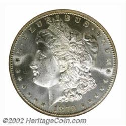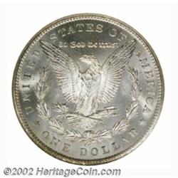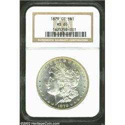 1879-CC S$1 MS65 NGC. The 1879-CC does not appear to have been released into circulation in significant numbers during the late 19th century. Many examples, however, were preserved in federal vaults at both the San Francisco Mint and the Treasury Building in Washington, D.C. The former source seems to have dried up after a few bags were paid out in the early years of World War II. In the early 1950s, it was the turn of the Treasury Department. Such were the quantities paid out that the '79-CC was generally available on the numismatic market through the end of that decade. We do note, however, that this issue has always been more difficult to locate than virtually all other Morgan Dollars from the Carson City Mint. Today, the '79-CC is widely recognized as the rarest CC-mint Silver Dollar of the 1878-1885 era. While we frequently offer Mint State examples in grades up to and including MS64, this is only the fourth MS65 representative that we have handled this year. The luster is full, frosty, and swirling with lovely cartwheel visual effects. There is some modest brightness in the fields, and bold striking definition is noted throughout. Virtually untoned with typically few distractions for the assigned grade. Population: 23 in 65, none are finer at NGC (7/02). Important notice: We expect to be auctioning lots at the rate of 200-250 per hour. Sometimes eBay Premier live bid software cannot keep up with that pace, so we strongly recommend that you place a realistic proxy bid now as insurance to avoid disappointment. Also please note that all Heritage/CAA lots purchased through eBay Premier carry a 20% Buyer's Premium. Please make sure you read the Terms and Conditions.