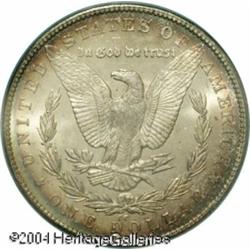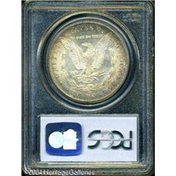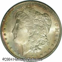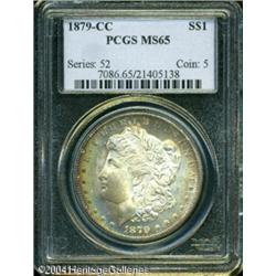 1879-CC S$1 MS65 PCGS. The 1879-CC does not appear <B>1879-CC S$1 MS65 PCGS.</B></I> The 1879-CC does not appear to have been released into circulation in significant numbers during the late 19th century. Many examples, however, were preserved in federal vaults at both the San Francisco Mint and the Treasury Building in Washington, D.C. The former source seems to have dried up after a few bags were paid out in the early years of World War II. In the early 1950s, it was the turn of the Treasury Department. Such were the quantities paid out that the '79-CC was generally available on the numismatic market through the end of that decade. We do note, however, that this issue has always been more difficult to locate than virtually all other Morgan Dollars from the Carson City Mint. Today, the '79-CC is widely recognized as the rarest CC-Mint Silver Dollar of the 1878-1885 era. While we frequently offer Mint State examples in grades up to and including MS64, Gems are very scarce and do not appear in every sale. <BR> The luster displayed by this piece is full, frosty, and swirling with lovely cartwheel visual effects. There is some modest brightness in the fields, and bold striking definition is noted throughout. Beautifully toned on both obverse and reverse, primarily near the peripheries, with typically few distractions for the assigned grade. <BR><BR><B>Important notice:</B> Heritage usually auctions material at the rate of 200-250 lots per hour. On some occasions eBay Live bid software or the Internet may not be able to keep up with the pace of the auction. We recommend placing a realistic absentee bid now as insurance to avoid disappointment. Occasionally the auctioneer may eliminate or reject an eBay Live bid, and the auctioneer may also reopen a lot after the close of the eBay live bidding (usually because we missed an audience bid), and may reject your bid even if it shows you as the winning bidder. By bidding via eBay Live, you agree that Heritage may award the lot to another bidder at its sole discretion under the circumstances described above or any other reasonable circumstances. Since eBay bids are not shown to us until we open the lot on the floor, we treat those bids just like floor bids. In most cases the floor responds before the eBay bid is presented to us, due to Internet lag time, so for consistency we have made it a policy that floor bids are always considered first over tie eBay live bids. Also please note that all Heritage lots purchased through eBay Live carry a 20% Buyer's Premium. Please make sure you read the Terms and Conditions before you bid. This lot is being auctioned in conjunction with a live floor auction by Heritage Galleries & Auctioneers. All final auction and invoice information will be supplied by Heritage Galleries & Auctioneers, and all other information should be considered preliminary. Lot:7326
