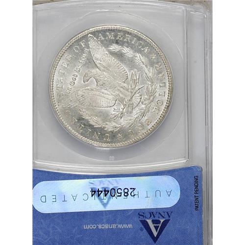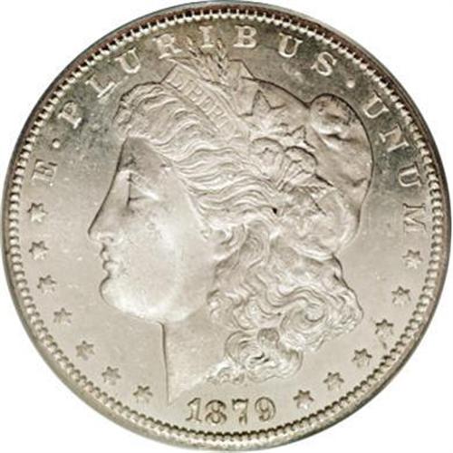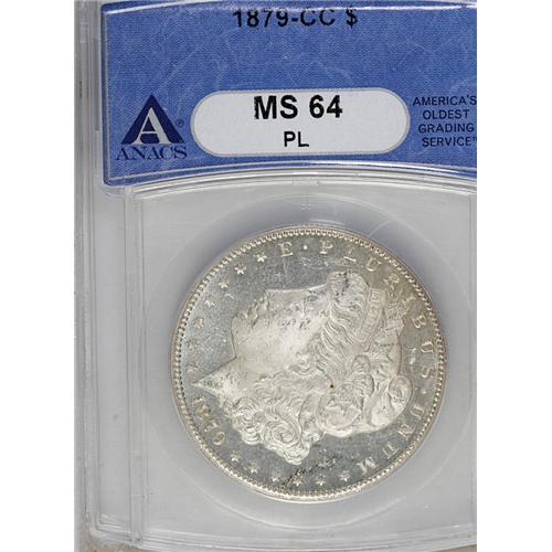 <B>1879-CC<img border='0' src='http://www.heritagecoins.com/images/star.gif' width=10 height=10>$1> MS64 Prooflike ANACS.</B></I> A nicely cameoed example with an overall milky sheen that is more frequently found on reflective 1880-CC Morgans. Luster grazes on the face of Liberty and the eagle's breast are shallow and relatively inoffensive. It is tempting to call this piece brilliant, but when closely examined there is just the slightest hint of peripheral toning on the obverse. A well, but not quite fully struck example of this "Perfect Dies" near-Gem. <BR><BR><B>Impo