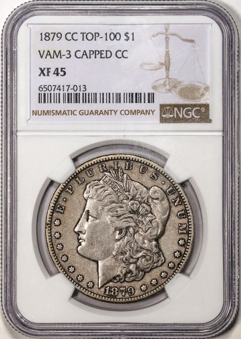 One 1879-CC Vam-3 Capped Top-100 $1 Morgan Silver Dollar Coin NGC XF45. NGC Certified.