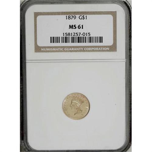<B>1879 G$1 MS61 NGC.</B></I> NGC Census: (9/154). PCGS Population (10/203). Mintage: 3,000. Numismedia Wsl. Price for NGC/PCGS coin in MS61: $475. (#7580)<BR><BR><B>Coin Engraver:</B> James B. Longacre<BR><BR><b>Shipping:</b> Coins & Currency (<a target="_blank" href="http://www.heritageauctions.com/common/shipping.php">view shipping information</a>)