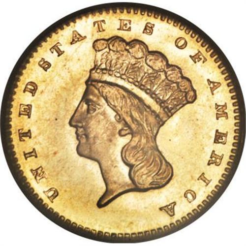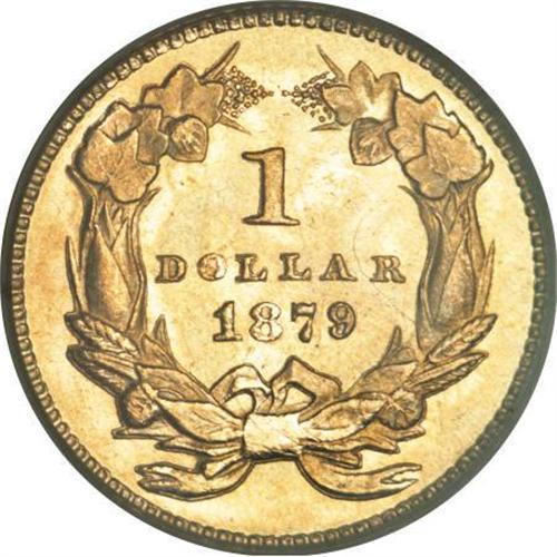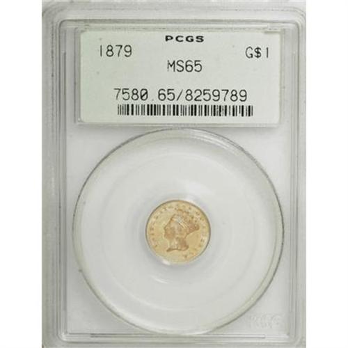 <B>1879 G$1 MS65 PCGS.</B></I> An absolutely incredible Gem in an older green-label holder. Both sides have brilliant yellow-gold luster with satiny reflectivity. Just 3,000 examples were coined, and unlike similar mintage dates in the 1880s, the 1879 has a relatively low population. Population: 53 in 65, 35 finer (1/08).<BR><BR><B>Coin Engraver:</B> James B. Longacre<BR><BR><b>Shipping:</b> Coins & Currency (<a target="_blank" href="http://www.heritageauctions.com/common/shipping.php">view shipping information</a>)