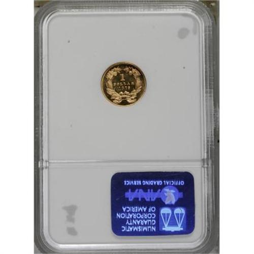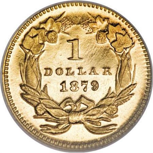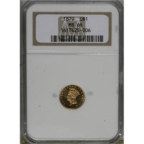 <B>1879 G$1 MS66 NGC.</B></I> A prooflike example, although undesignated as such due to the age of the NGC holder. The radiant devices and glassy fields are virtually as struck. The 1879 has a tiny business strike mintage of 3,000 pieces, yet is surprisingly affordable in quality Mint State. Census: 28 in 66, 10 finer (2/08).<BR><BR><B>Coin Engraver:</B> James B. Longacre<BR><BR><b>Shipping:</b> Coins & Currency (<a target="_blank" href="http://www.heritageauctions.com/common/shipping.php">view shipping information</a>)