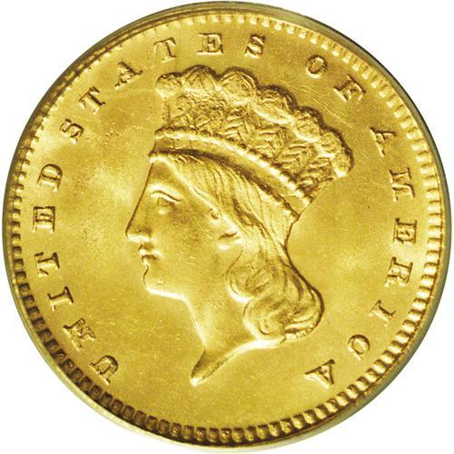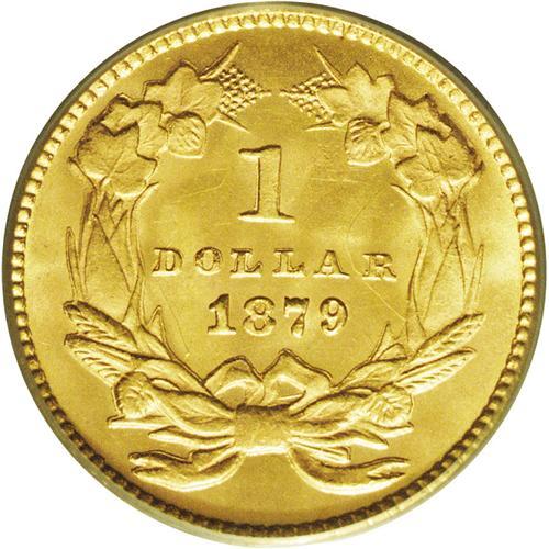 <B>1879<G$1> MS66 PCGS.</B></I> This is an impressive example with few peers. The mintage was a limited 3,000 coins, produced at a time when all of the Mints were concentrating on Morgan dollar production. Unlike many others, this example has brilliant and frosty light yellow luster. The surfaces are not prooflike as usual. Light clash marks provide additional proof that this is a business strike example. The letters BER of LIBERTY are weak on this example, apparently as always. Population: 28 in 66, 3 finer (4/06).