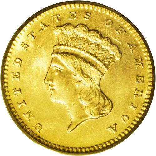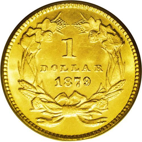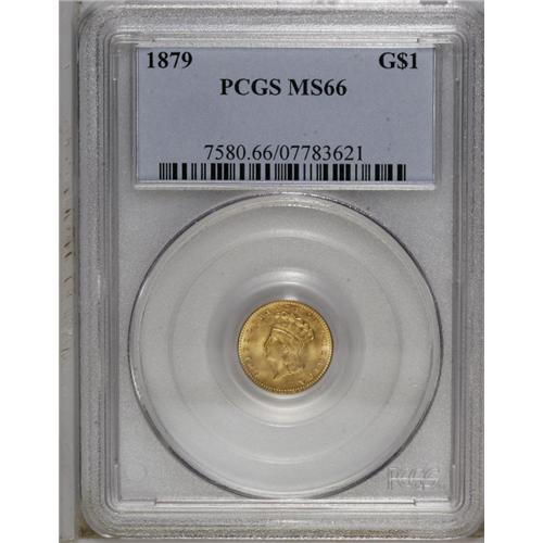 <B>1879<G$1> MS66 PCGS.</B></I> This is an impressive example with few peers. The mintage was a limited 3,000 coins, produced at a time when all of the Mints were concentrating on Morgan dollar production. Unlike many others, this example has brilliant and frosty light yellow luster. The surfaces are not prooflike as usual. Light clash marks provide additional proof that this is a business strike example. The letters BER in LIBERTY are indistinct, lapped from the obverse die and diagnostic of the issue. Population: 29 in 66, 3 finer (9/06).