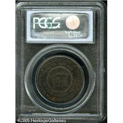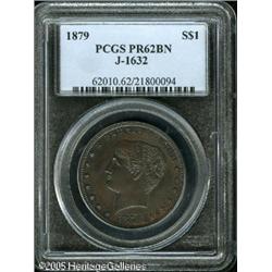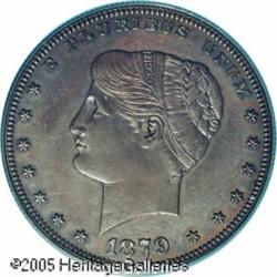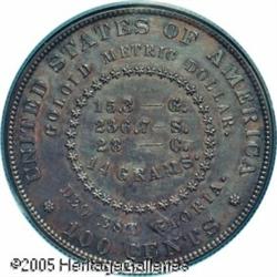 <B>1879<img border='0' src='http://www.heritagecoins.com/images/star.gif' width=10 height=10>$1 Goloid Metric Dollar, Judd-1632, Pollock-1829, Low R.7, PR62 Brown PCGS.</B></I> This is the rare variety with Liberty featuring a Coiled Hair style, rather than the usually seen Flowing Hair design. A tiny M on the bust truncation confirms this as the work of George Morgan, assistant to the Barber's at the Mint. George Morgan's tenure at the Mint lasted half a century, but it was not until the death of Charles Barber that Morgan finally reached the position of Chief Engraver, a title he enjoyed for only a few short years until his own death. This example has intermingled light and dark brown with splashes tan color near the borders. The surfaces are subdued with little remaining mirrored finish. It is still an attractive and desirable example of the variety. Lot:9871