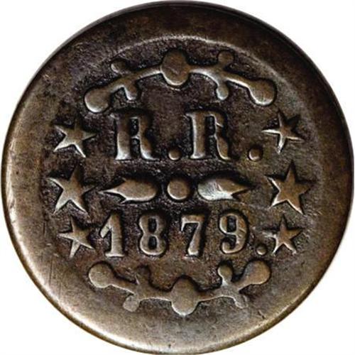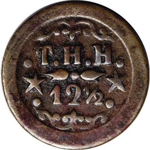 <B>1879 Hawaii T.H. Hobron Token XF</B></I> Bronze, 22 mm 12 1/2 cents token. Obverse: T.H.H./ 12 1/2. Scrolling above and below letters & numbers, a star and two dots on either side. The reverse R.R./ 1879 with scrolls above and below, stars left and right. What appears to be wear may in fact be a weak struck on this pleasant and collectible token, which is listed in the <I>Guide Book.</B></I><BR><BR><b>Shipping:</b> Coins & Currency (<a target="_blank" href="http://www.heritageauctions.com/common/shipping.php">view shipping information</a>)