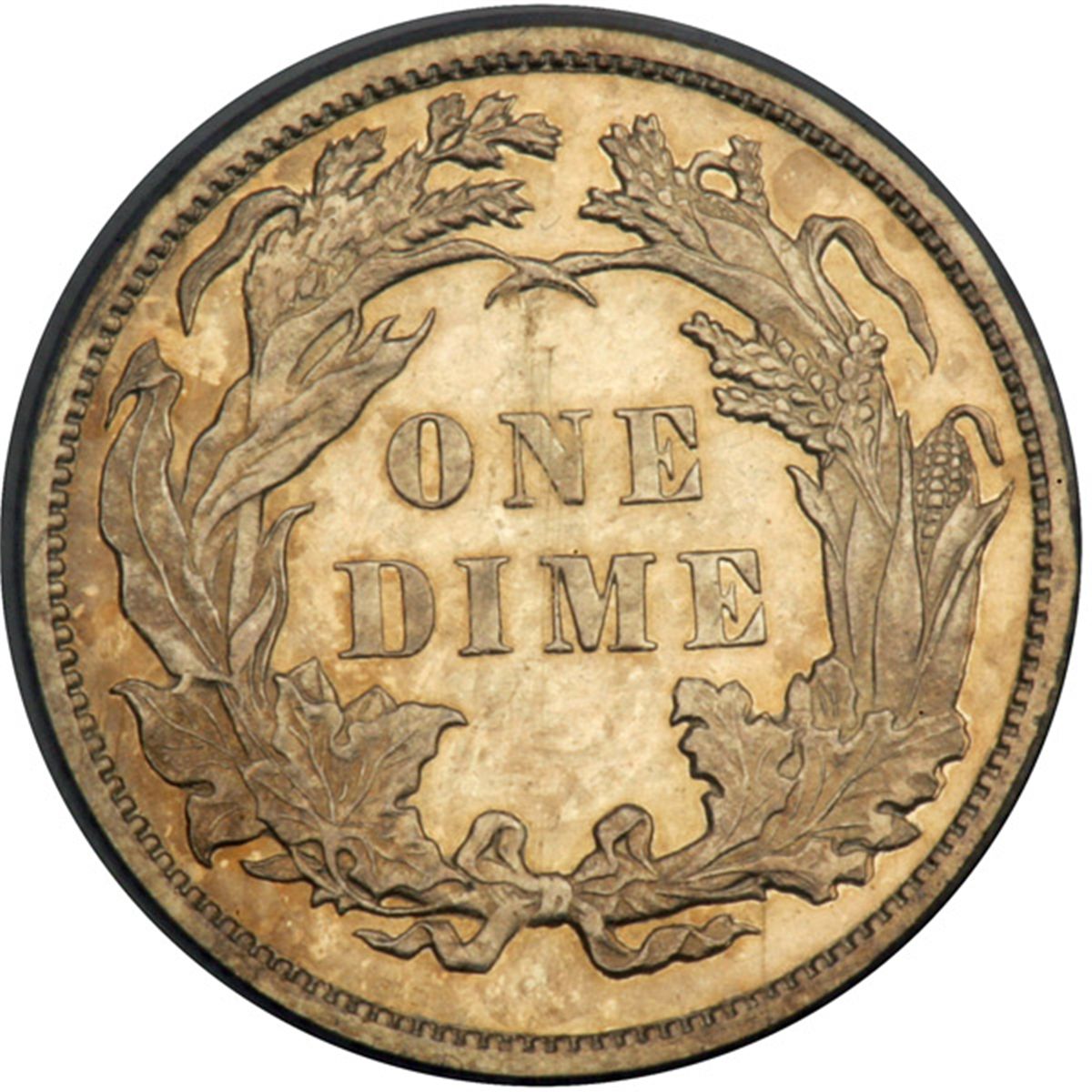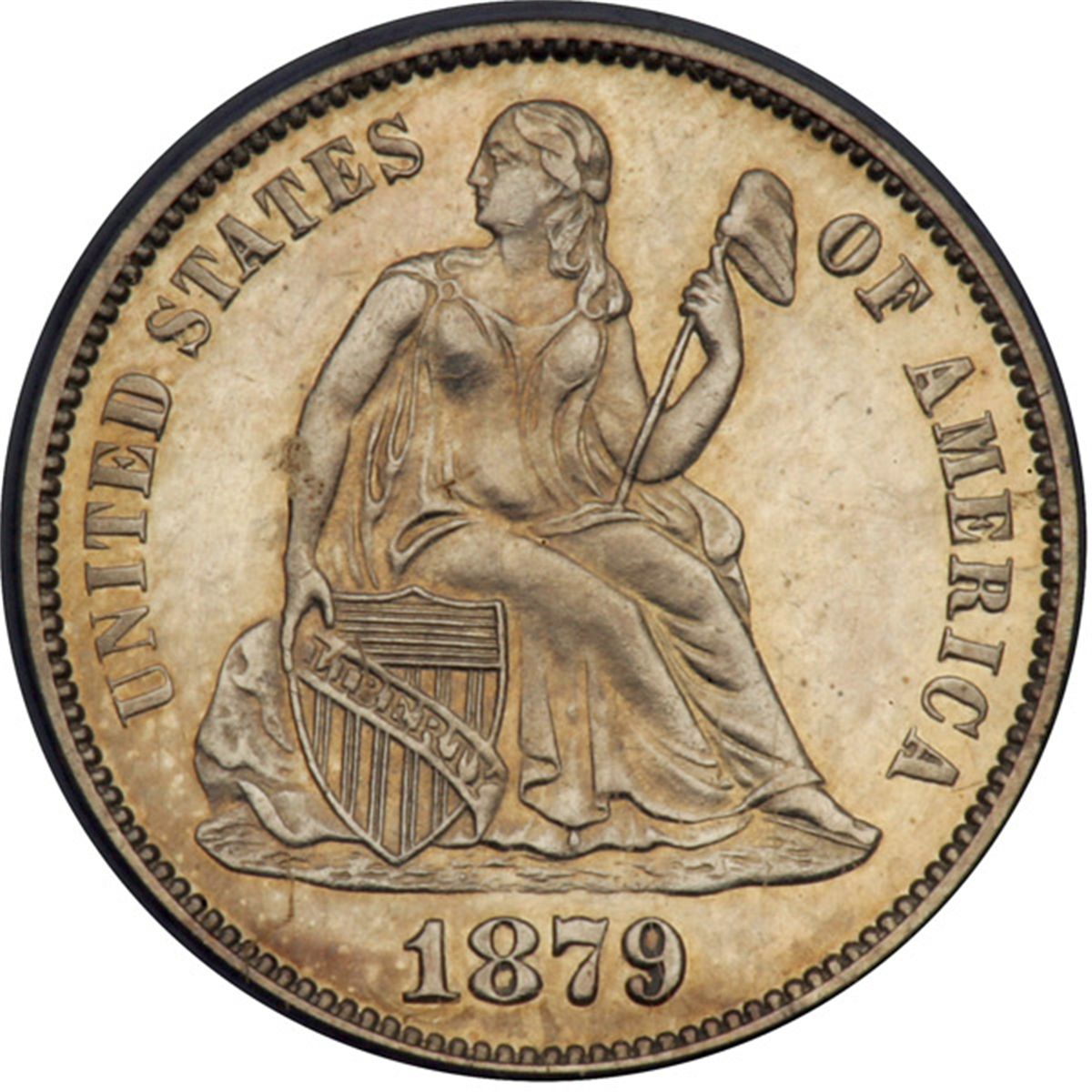 1879 Liberty Seated Dime. PCGS graded Proof 64 Cameo. A nice untoned coin. Only 1,100 minted. Fully original with pale silvery to faint golden shades acquired through the years. With such splendid surfaces, it confirms the grade that the coin is struck with mathematical precision by the dies. Pop 26; 21 finer, 15 in 65, 4 in 66, 2 in 67 (PCGS # 84776) .