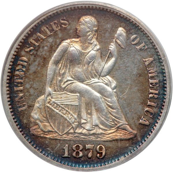 1879. PCGS graded Proof 64. CAC Approved. Lovely gold and blue toning. Only 1,100 Proofs struck. Pop 71; 51 finer (PCGS # 4776) .